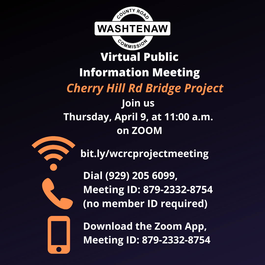 WHY: The Washtenaw County Road Commission (WCRC) will hold a virtual project information meeting about replacing a portion of the Cherry Hill Rd Bridge over Fleming Creek, between Gale Rd and Plymouth Rd in Superior Township.
