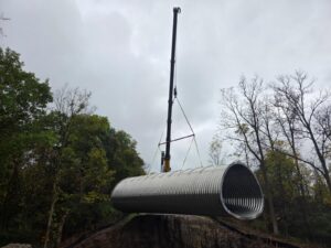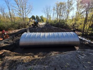 On Tuesday, October 7, 2025, following the placement of bedding material, J. Sebastian Trucking & Excavating, the contractor working on behalf of WCRC, used a crane to lower the new culvert into place on Warren Rd between Dixboro Rd and Thornwood Ct in Ann Arbor Township.